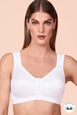 Qualitätsmarke Anita überzeugt mit Spitzen-Design. Blickfang des femininen Spezial-BHs Lucia ist die unterfütterte grafische Blütenstickerei am Dekolleté, die durch eine zarte Satinschleife gekonnt abgerundet wird. Viergeteilt mit Brustquernaht und seitlicher Blende sitzen die BH-Cups sicher und angenehm. Die beidseits eingearbeiteten Prothesentaschen bestehen aus weicher Baumwolle und liegen angenehm auf der Haut. Der bügellose Prothesen BH Lucia von Anita Care mit Prothesentaschen überzeugt durch hochwertiges Material und perfekten Schnitt. Dank seiner luftdurchlässigen Struktur sorgt er für einen spürbaren Klima-Komfort. Die zarte Blüten-Stickerei mit Unterfütterung, die Transparenz verhindert, zaubert frische Akzente in das wunderschöne Design des Prothesen BHs. Die komfortablen Träger sind verstellbar und entlasten Schultern und Nacken. Der weiche Rückenverschluss wird mit zunehmender Größe breiter.