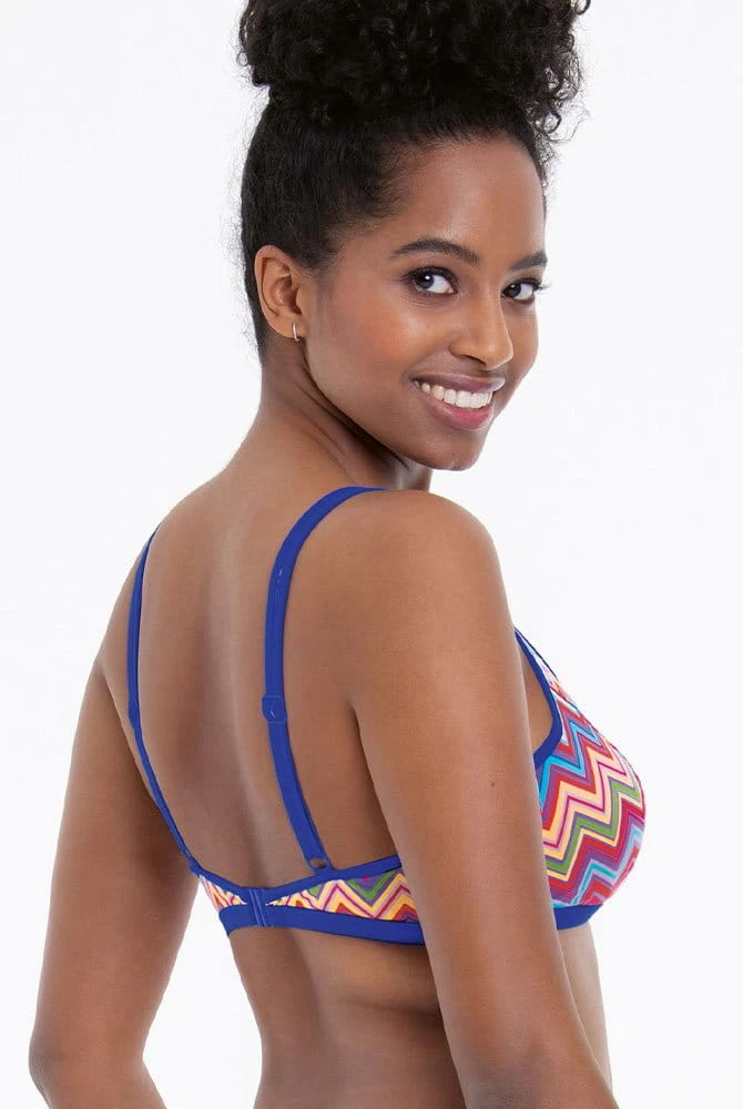 Bikini Oberteil Laila der modischen jungen Serie Magic Wave von Qualitätsmarke Anita Care trumpft mit farbenfrohem Zickzack-Print auf. Das macht gute Laune! Das designstarke Prothesen Bikini Top Laila überzeugt mit weichen unterfütterten Cups, die Halt geben und Transparenz vermeiden. Für optimalen Tragekomfort und Sicherheit sorgen verstellbare weiche Komfortträger. Diskrete Prothesentaschen auf beiden Seiten nehmen Ihre Brustprothese sicher auf und verhindern ein verrutschen. Das im Bustier Stil geschnittene Bikini Top Laila schmeichelt Ihrer Figur und ist der optimale Begleiter für Ihr Rendezvous mit der Sonne. Ergänzen Sie zum Prothesen Bikini Top die passende Badehose Ive Bottom und tragen Sie ein traumhaftes Bade-Set.